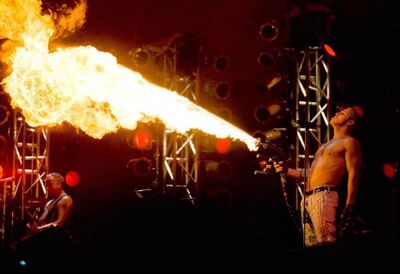 • During Rammstein, instead of the usual burning coat, Till was wearing the outfit normally used when opening with Spiel mit mir. He was also equipped with a flamethrower.[1]