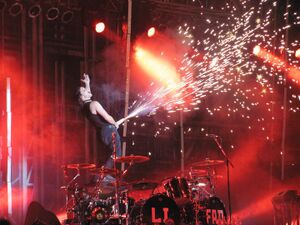 After Till shot the gun, the red fireworks would come down and a big, red curtain of flames would appear at the front of the stage.