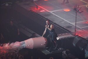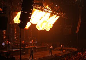 Throughout the song, bursts of smoke would occasionally launch up from the ground. This effect originates from the Reise, Reise Tour.