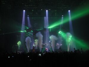 While the stage would be covered in total darkness, green lasers would descend from the ceiling. These lasers would originate from the eyes of dolls hung with a noose from the ceiling. At the end of the song, multiple explosions would go off, these would hit the dolls, making them fall to the ground.