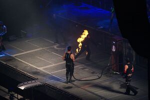 A crewmember dressed as a fan, wearing a "Rammstein" hoodie, would go up on stage and face the crowd. Till would use his flamethrower to set him on fire and he would then run around on stage frantically before being put out by other crewmembers.