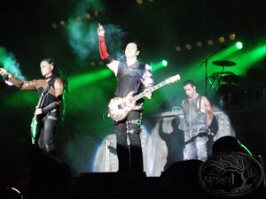 During the guitar solo, Paul and Richard would go to the middle of the stage. A metal sleeve with several tubes mounted to their right arms would start to produce small flames whilst playing.