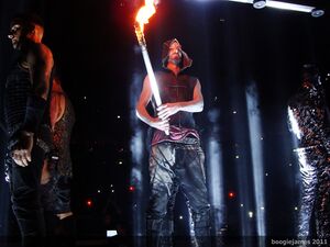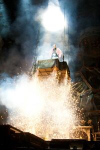 | Before the first verse, Till would be on one of the lamp lights which would be lowered down with sparks falling from it | |