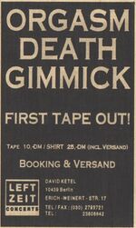 A miniature leaflet, housed inside of the cassette case tells us that Orgasm Death Gimmick's promotional agency planned to sell cassette tapes for 10 Deutsche Marks, and T-Shirts for 25 Deutsche Marks, indicating a larger amount of planning into the band's activities than was previously assumed.