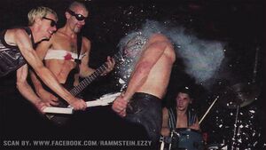 | There is only one known time it was used for Du hast. Near the end of the song, Till unzipped his pants and pulled out a dildo which soon started squirting. Additionally for Bück dich, before the whole thing, Flake would come to Till, bend over before him and start walking on all fours. | |