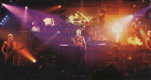 | This stunt would only be used at open air venues or in big concert halls. Technicians would place some smoke bombs that would go off halfway through the song, the generated smoke would be blown away towards the audience with big fans. The stage would barely be seen behind the smoke at some point. | |