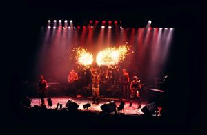 | After the intro, Till would jump onto the stage with set off sparkle fountain fireworks attached to his boots. There is one known time it was used for Engel in which Schneider used one boot instead of two and danced around while it went off during the solo. | |