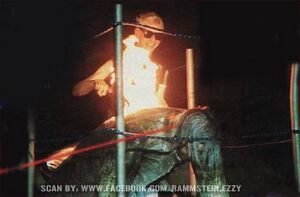 | Right before the beginning of the first verse, a fake bass drum would start to go up in flames. Till would usually be hiding behind it and reveal himself by pushing the drum aside. | |