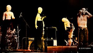 | 9 April 1997: Similar to the Herzeleid tour shows, the doll was dressed in pieces of paper or fabric that resembled a wedding dress and a veil. The doll, as well as its "clothes", looked bloodstained and burnt. The explosion was triggered by Flake shortly after Till's intro part. 1997 - 30 August 1997: There would be multiple dolls (usually four) dressed only in black skirts. In July these would have creepy white masks on their faces. They would explode in pairs after Till's intro part. Sometimes they would be set on fire. | |